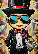 Dette maleri viser en ung mand i et sort jakkesæt og høj hat, med solbriller og en avis i hånden.
