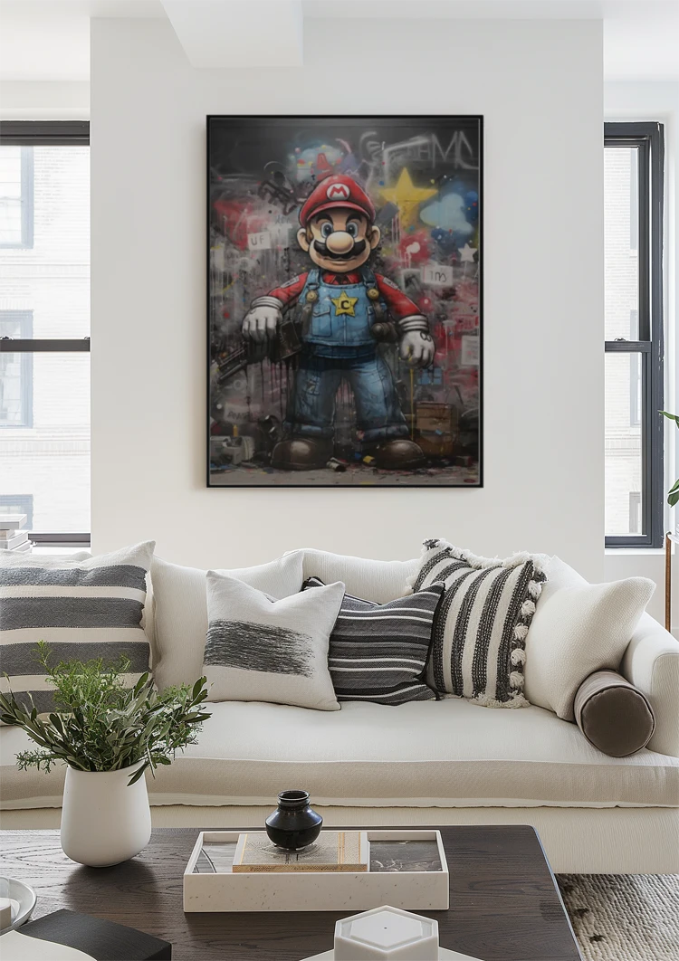 Dette maleri forestiller en grov version af Super Mario fra videospillet. Graffiti kan ses i baggrunden.