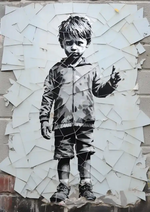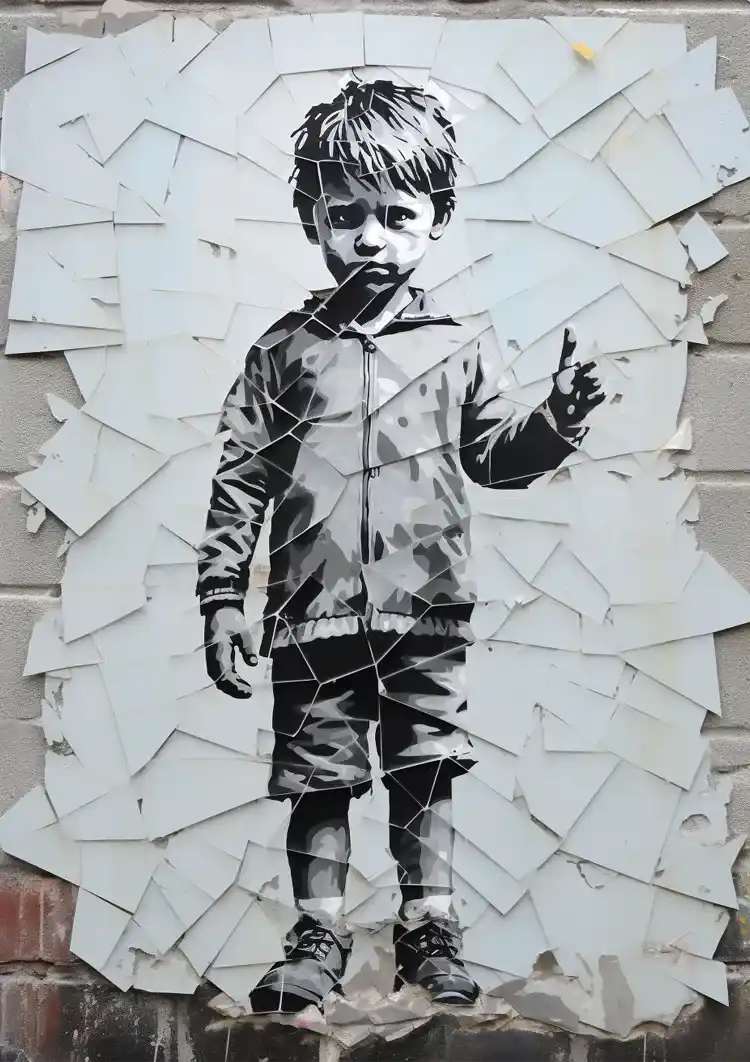 Dette maleri viser gadekunst af en ung dreng i en jakke, udført i sort-hvid med en knust baggrund på en væg.