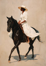 Zeitloses Motiv einer Frau zu Pferd, bei dem Bewegung und Eleganz im Mittelpunkt stehen.