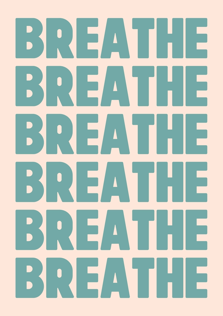 Dette tidløse maleri udstråler ro med det gentagne ord "Breathe" mod en lyserød baggrund, fremhævet af en slående turkis. En beroligende tilføjelse til ethvert rum.