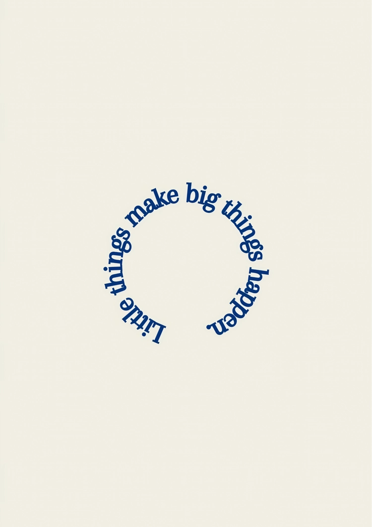 Dette maleri udstråler inspiration med teksten "Little Things Make Big Things Happen", arrangeret i et cirkulært mønster i blå skrift på en rolig beige baggrund. Det minder os om kraften i små handlinger.