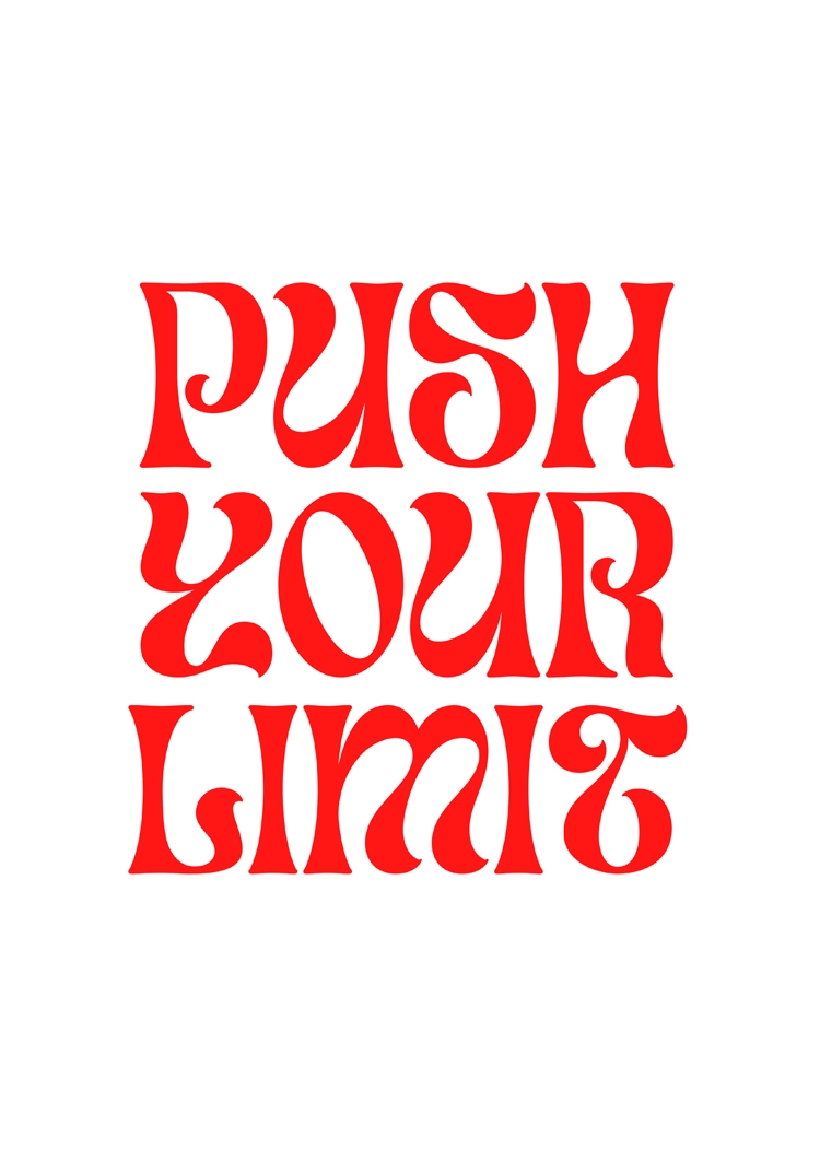 Dette inspirerende maleri med budskabet "PUSH YOUR LIMIT" (Press din grænse) med fede røde bogstaver, opdelt i tre rækker med en kreativ, let forvrænget skrifttype, opfordrer til personlig vækst og udholdenhed. En stærk påmindelse om at presse grænser!