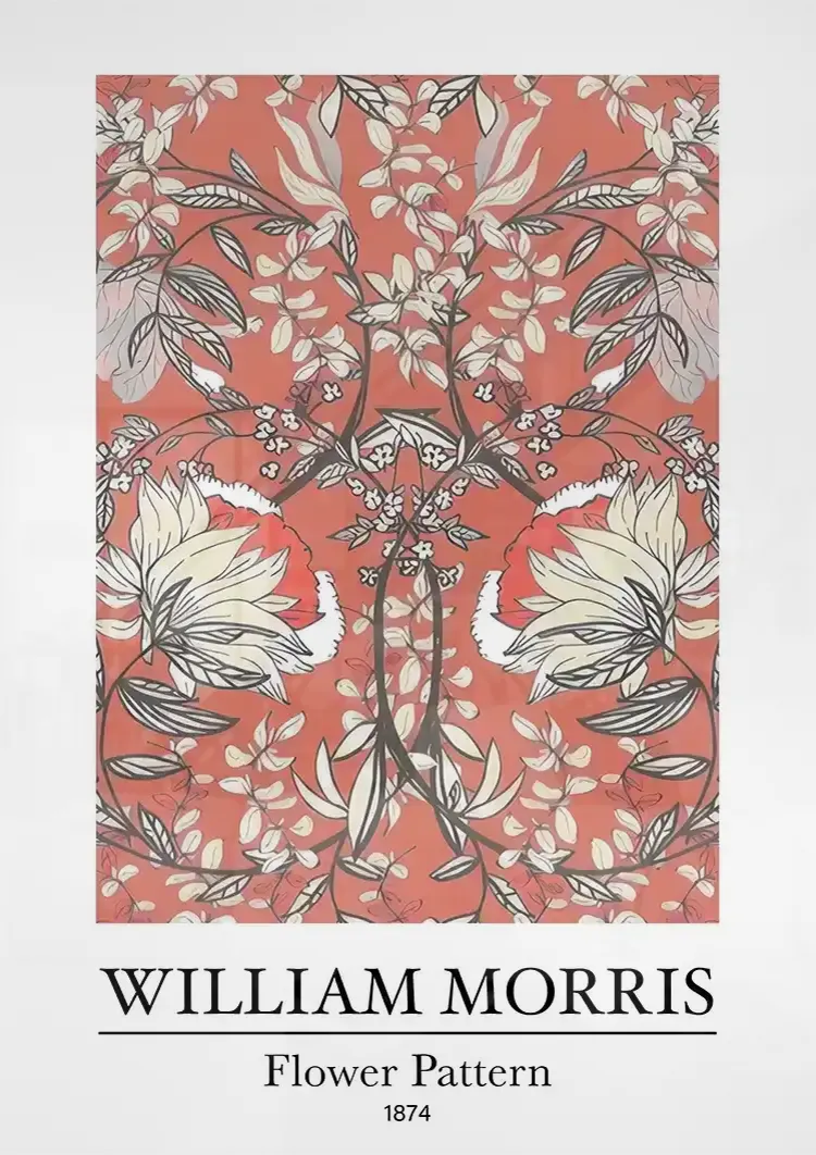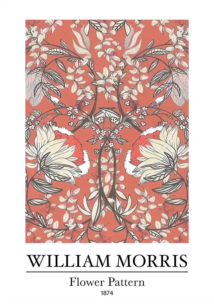 Dette maleri, kaldet "Blomstermønster", har et smukt designet blomstermotiv af William Morris fra 1874 med symmetriske hvide, lyserøde og grønne blomster og blade på en livlig rød baggrund.