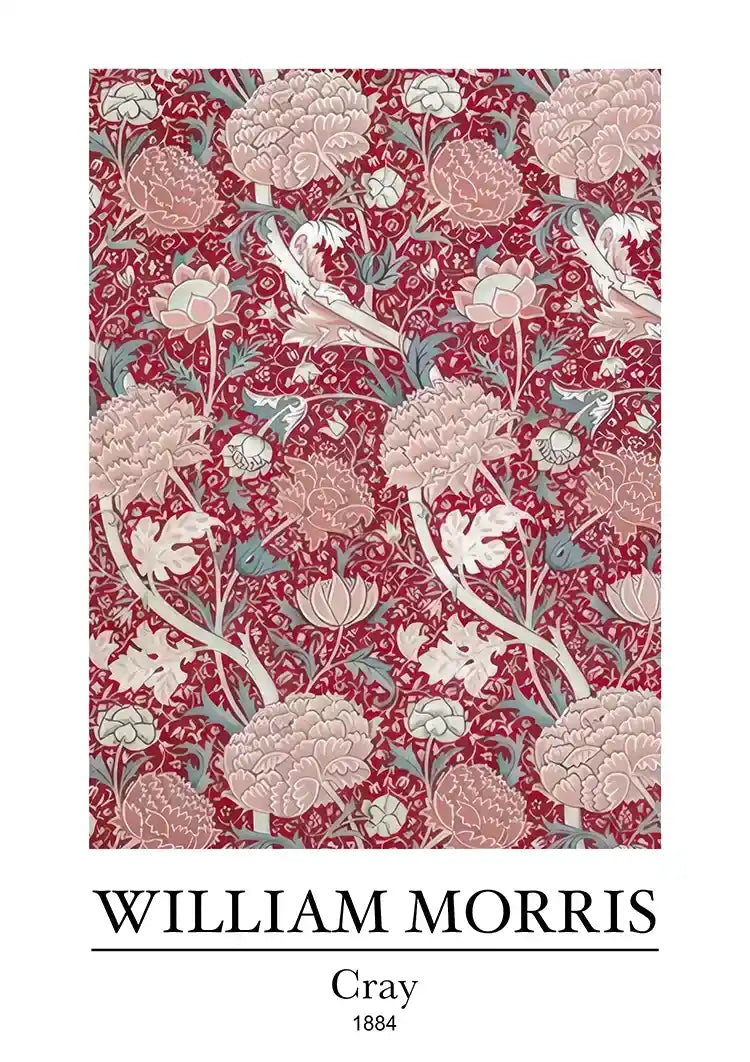 Dette maleri med titlen "Cray" af W. Morris har et unikt blomstermønster med lyserøde, beige og grå nuancer mod en dybrød baggrund. Det er en fortryllende og moderne kreation.