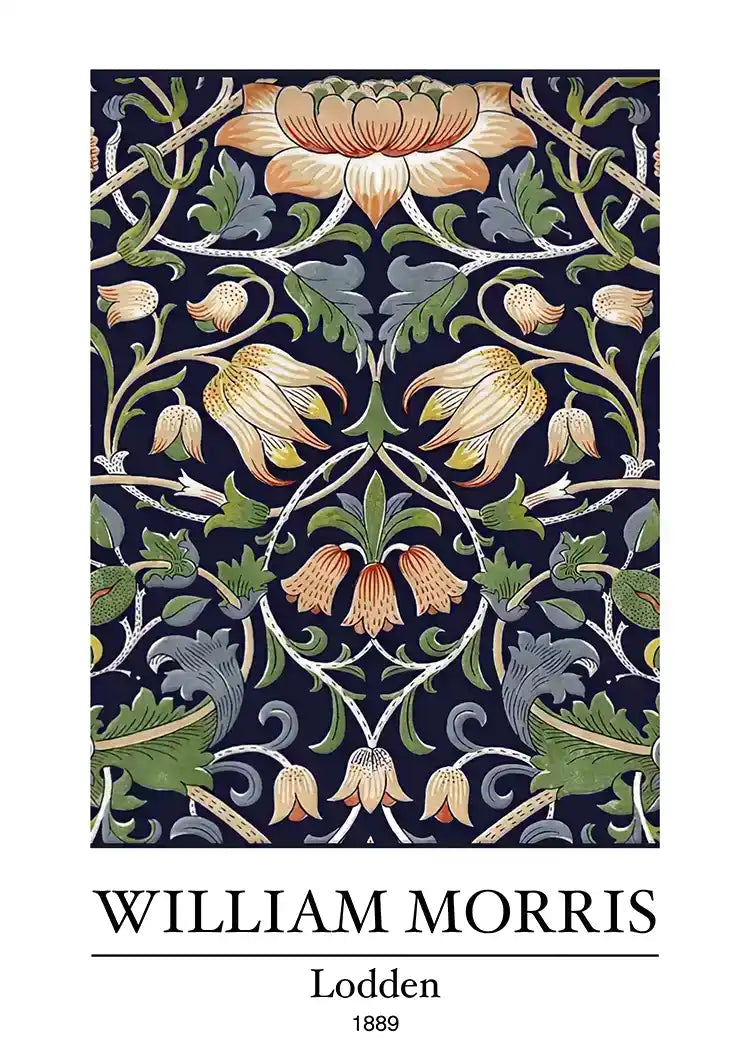 Dette maleri, kaldet "Lodden" og designet af William Morris, viser et detaljeret blomstermotiv med orange, grønne og beige toner på en mørk baggrund.