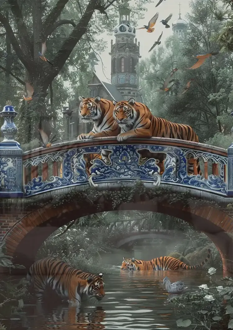 På dette maleri ser du en porcelænsbro omgivet af tigre.