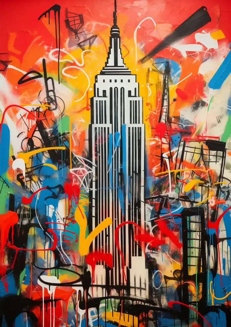 Dette maleri forestiller et farverigt abstrakt kunstværk af Empire State Building med et levende,