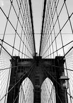 Et sort-hvidt maleri af Brooklyn Bridge med dens mange kabler og et af de gotiske tårne, set fra gangstien.
