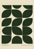 Et grafisk maleri med et gitter af mørkegrønne former, der hver indeholder en stiliseret bladform, hvilket skaber et sømløst mønster.