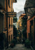 Dette maleri viser en smal gyde mellem bygninger med bjerge i baggrunden.