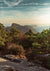 Dette maleri forestiller et bjergrigt landskab med frodige grønne træer i forgrunden og barske klipper i det fjerne under en blødt farvet himmel.