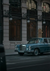 En blå vintage-Mercedes kører forbi den udsmykkede facade af Hermès-butikken på en gade.