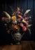 Dette maleri forestiller et smukt blomsterarrangement i en dekorativ krukke med en blanding af tørrede og friske blomster i nuancer af gul, lyserød og orange. Arrangementet står på en træoverflade mod en mørk, tekstureret baggrund, hvilket fremhæver blomsternes kontrast og livlighed.