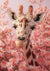 Dette maleri forestiller en giraf blandt lyserøde og hvide blomster, hvis hoved og lange hals hæver sig over blomsterne. Baggrunden er blød og fyldt med blomster, hvilket skaber et harmonisk naturscene, mens giraffen er fanget centralt og detaljeret.