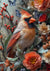 Dette maleri viser en detaljeret skulptur af en farverig kardinalfugl blandt livlige blomster og blade. Den har et lyst orange næb og et smukt fjerdesign med sommerfugle og bær i baggrunden.