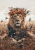 I dette maleri sidder en majestætisk løve med en fuld manke i en mark med højt græs, kronet med farverige blomster. Fugle svæver og hviler på løven og det omkringliggende grønne, mens den disede himmel skaber et fortryllende vildmarksscene.