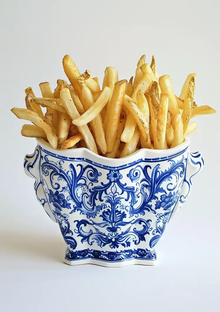Dette maleri forestiller en stak pommes frites serveret i en udsmykket blå og hvid keramikbeholder med blomstermotiver og håndtag på begge sider mod en neutral baggrund.