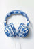 Dette maleri viser hovedtelefoner med et blåt og hvidt blomstermønster. Hovedtelefonerne har bløde ørepuder og et pandebånd med det samme blomsterprint.