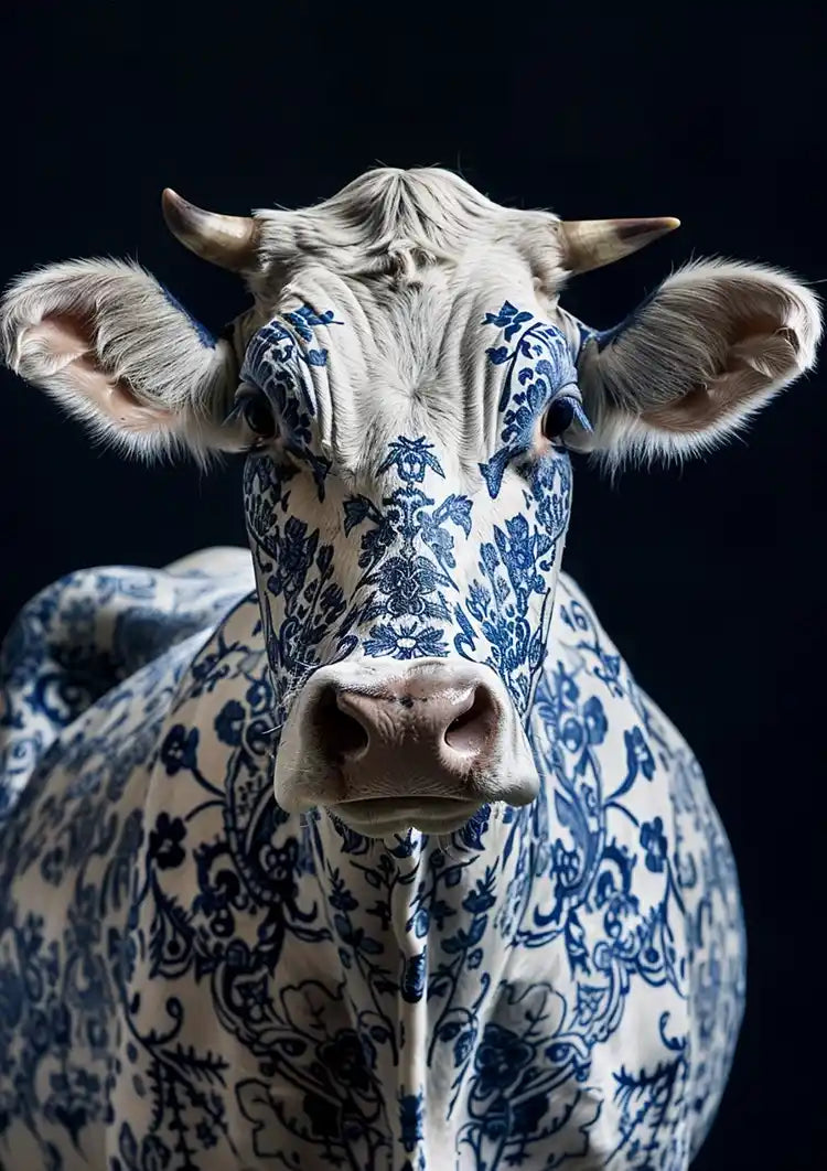 Maleri af en ko med indviklede blå og hvide blomstermotiver. Det detaljerede kunstværk står smukt frem mod en mørk baggrund.