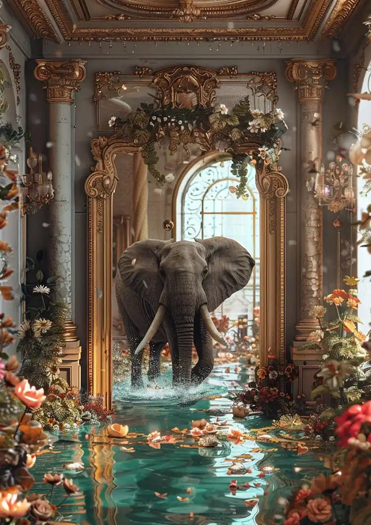 Dette maleri forestiller en elefant i et rigt dekoreret rum med marmorsøjler og et gulv delvist nedsænket i vand med flydende blomster og gulddetaljer.