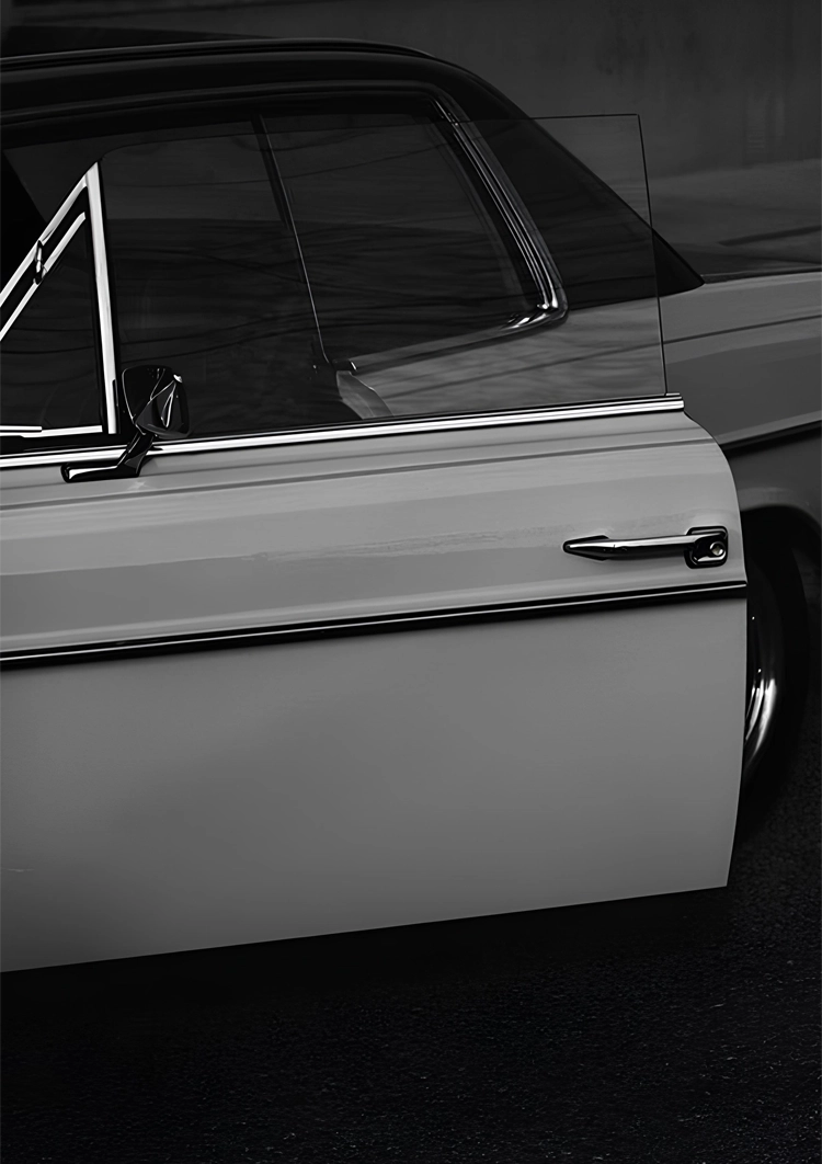 Dette elegante sort-hvide maleri indfanger den strømlinede sidevisning af en veteranbil og understreger dens tidløse klasse og flydende linjer. En slående hyldest til bildesign.