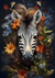 Dette maleri viser et zebrahoved omgivet af farverige blomster og blade mod en mørk baggrund.