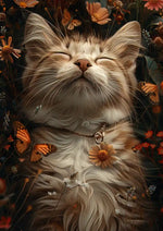 Dette charmerende maleri forestiller en afslappet kat med lukkede øjne, omgivet af orange og gule blomster, ledsaget af legende orange sommerfugle. Et fredfyldt motiv med et strejf af naturlig ro.