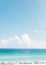 Et maleri af en glad og travl dag på stranden med en klar himmel.