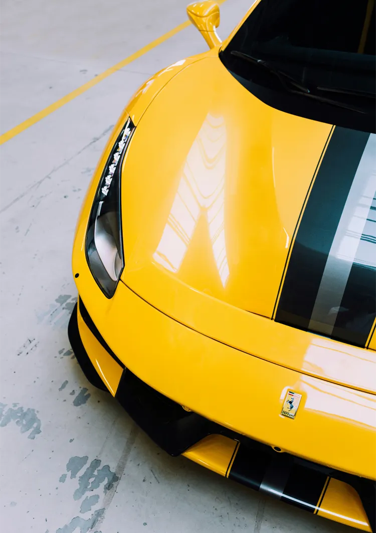 Dette maleri viser en top-down-visning af fronten af en gul Ferrari 488 Pista med sorte racerstriber, parkeret på et betongulv med gule markeringer.