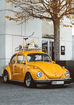 Dette maleri viser en farverig gul Volkswagen Beetle parkeret ved siden af en bygning under et træ med en cykel på tagbøjlen.