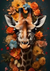 Dette maleri forestiller et girafhoved, der stiger op fra en tæt klynge af farverige blomster i forskellige nuancer af orange, gul og blå, mod en mørk blågrøn baggrund.
