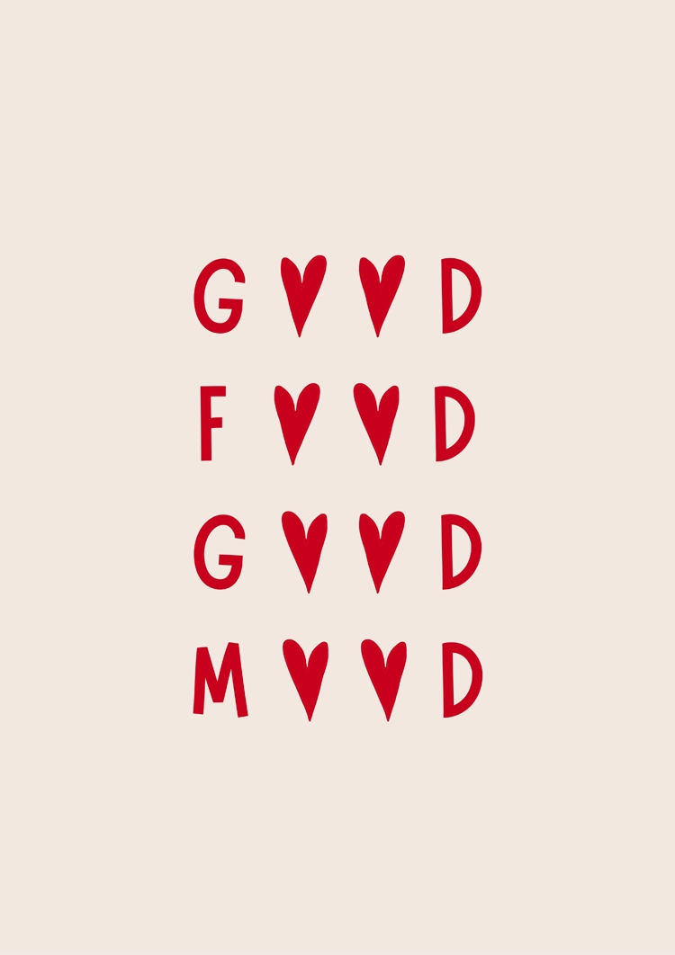 Et maleri med 'God mad, godt humør', skiftevis med røde hjerteformer, på en blød beige baggrund.