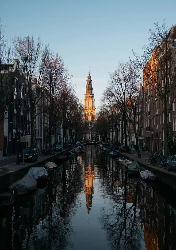 Dette maleri viser en fredfyldt tusmørke over en kanal i Amsterdam.