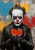 Dette maleri forestiller graffitikunst af en klovn i et sort jakkesæt, der holder et rødt hjerte, med et hvidt ansigt og mørke, indsunkne øjne.