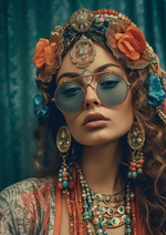 Dette maleri forestiller en kvinde med krøllet hår, runde blåtonede solbriller og en hovedbeklædning dekoreret med blomster, lagdelte halskæder og store øreringe mod en blågrøn baggrund.