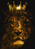 Et digitalt kunstværk forestiller et løveansigt udsmykket med blomstermønstre og lysende blå øjne. En gylden krone er placeret over dens hoved.