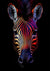 Dette maleri viser et nærbillede af en zebras hoved mod en sort baggrund, dens striber oplyst i livlige nuancer af rød, lilla og orange. Belysningen fremhæver smukt detaljerne ved dens ører, øjne og næse.