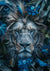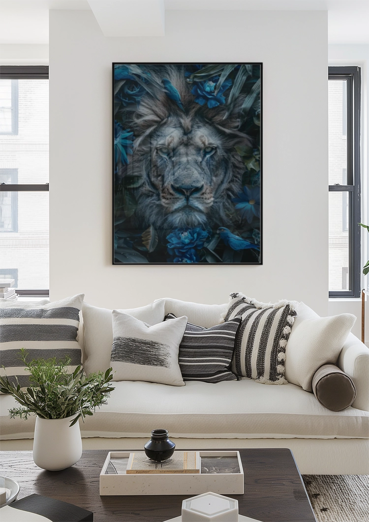 Dette maleri forestiller ansigtet af en løve omgivet af blå blomster og blade, mens små blå fugle sidder på planterne. Løvens rolige udtryk ser direkte på beskueren og indfanger et fredfyldt og majestætisk øjeblik i naturen.