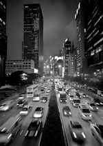 Sort-hvidt maleri af et udsigt over en trafikeret vej med høje bygninger.