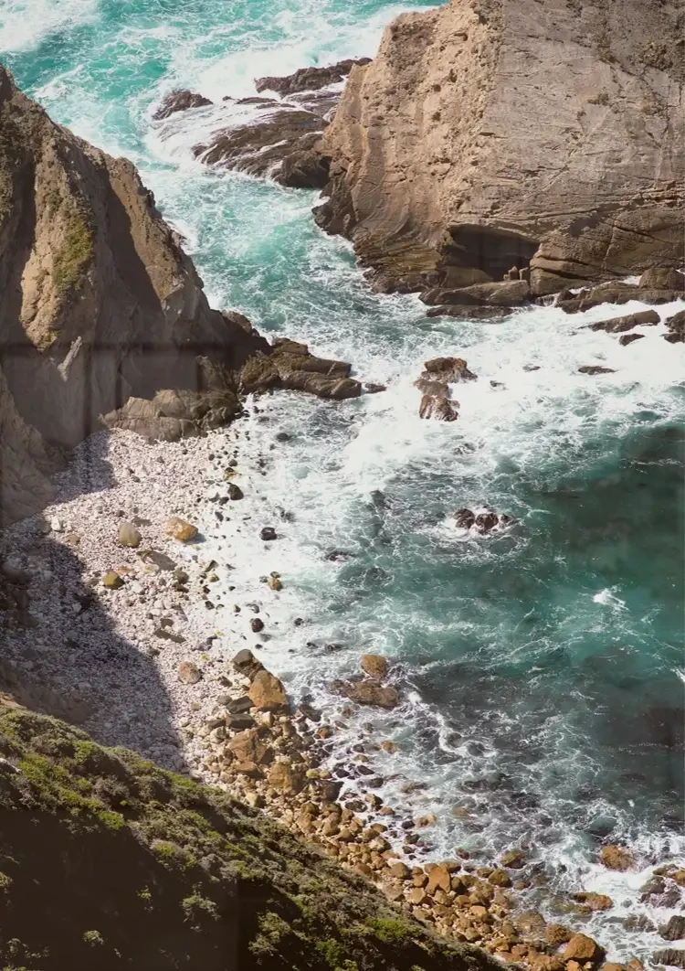 Et maleri med fugleperspektiv over havet, omgivet af klipper.