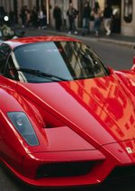 Dette maleri viser en rød Ferrari Enzo parkeret på gaden, med dens slående, slanke linjer og Ferrari-logo synligt. Baggrunden skildrer et travlt bymiljø med fodgængere.