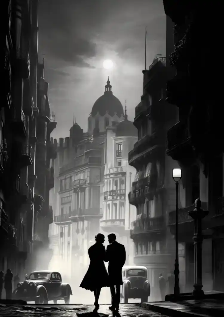 Et maleri med en silhuet af en mand og en kvinde, der står sammen i en smuk by.