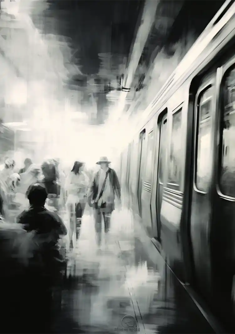 Et falmet sort-hvidt maleri af passagerer, der går ombord på et tog.