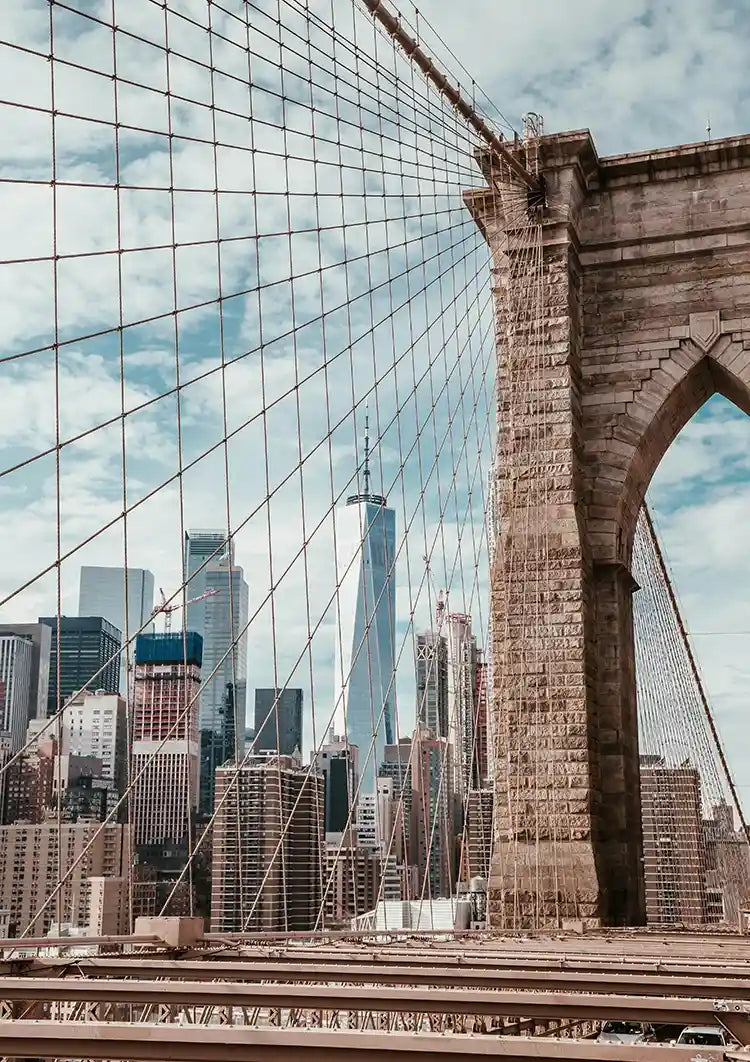 Dette maleri viser en udsigt over New York Citys skyline gennem kablerne og stenbuen på Brooklyn Bridge med One World Trade Center i baggrunden.