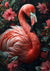 Dette maleri forestiller en livlig lyserød flamingo omgivet af frodigt grønt og lyserøde blomster. Dens hoved vipper til siden og afslører dens buede næb og detaljerede fjer, hvilket skaber et fantastisk billede.