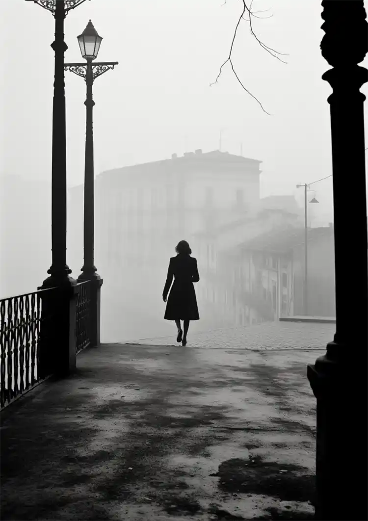Et sort-hvidt maleri af en dame med falmede omgivelser.