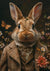 Dette maleri viser et digitalt illustreret billede af en kanin klædt i et vintage-stil jakkesæt med butterfly. Kaninen står oprejst, omgivet af blomster og sommerfugle, med detaljeret pels og udtryksfulde øjne.