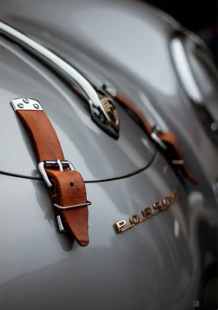 Dette maleri viser et nærbillede af et vintage Porsche-emblem på et gråt karrosseri. De brune læderspænder fuldender denne klassiske bil.
