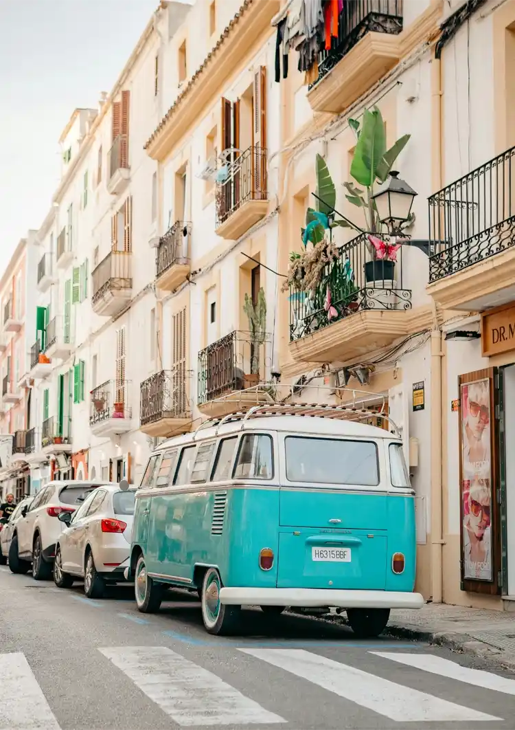 En vintage turkis Volkswagen varevogn parkeret på en gade omkranset af traditionelle bygninger i europæisk stil med altaner, nogle udsmykket med planter og vasketøj.